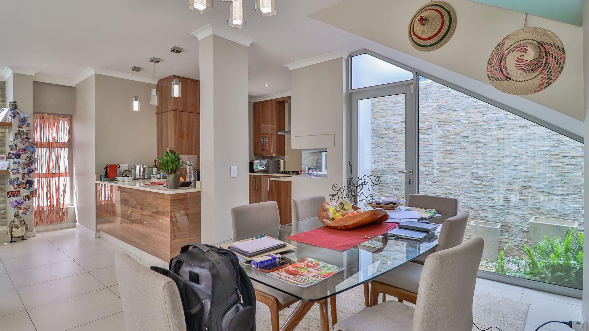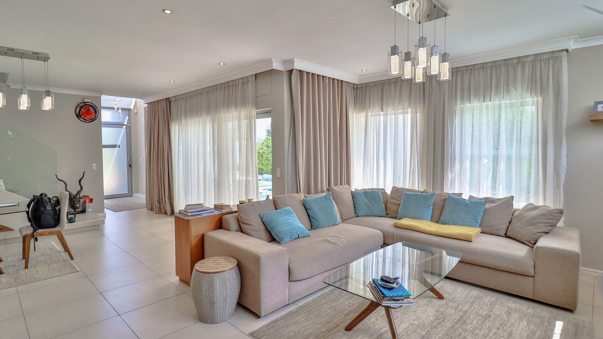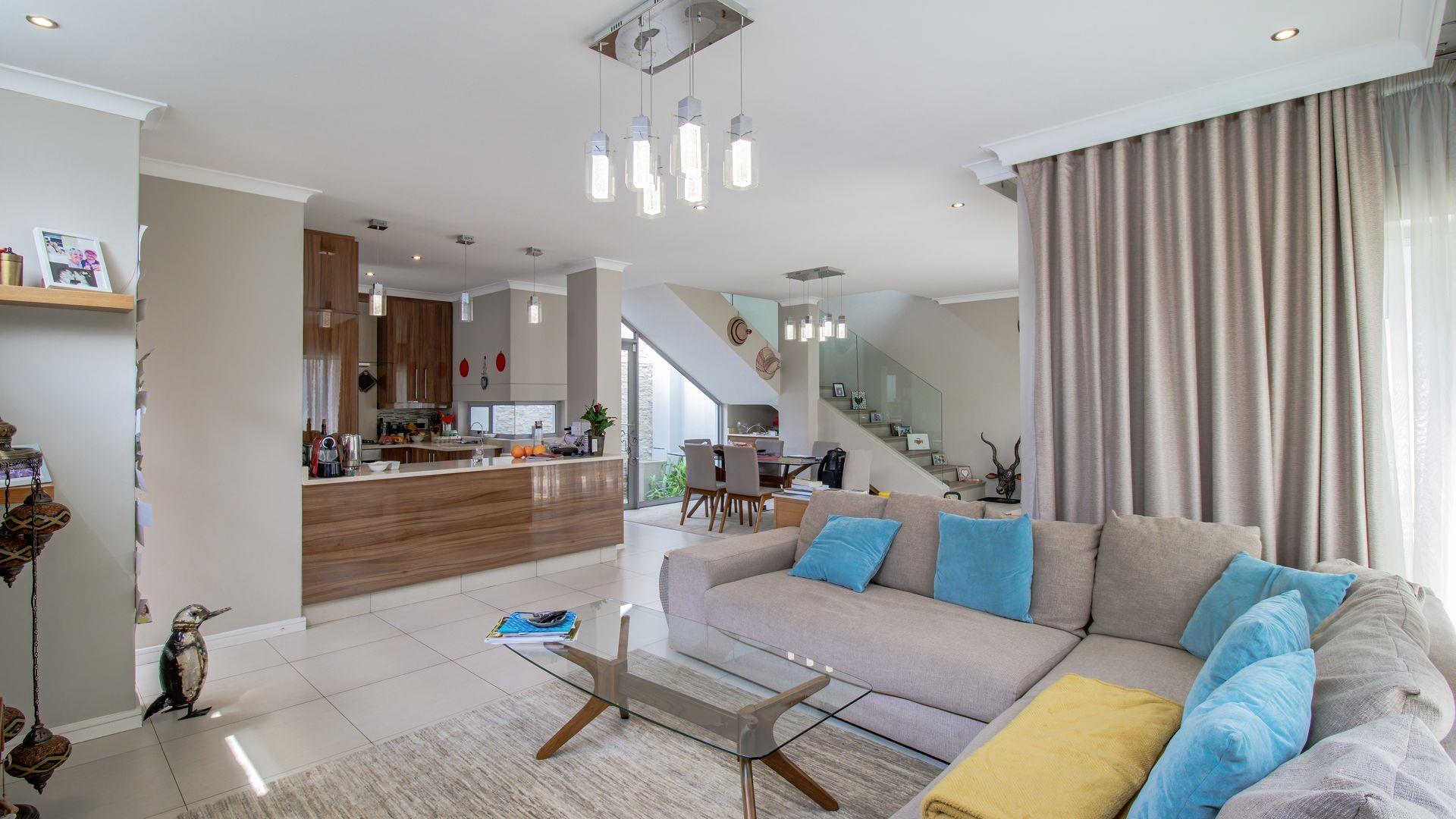 This elegant three-bedroom double-story cluster offers the perfect blend of comfort, style, and secure living. Designed with modern convenience in mind, the home features spacious open-plan living and dining areas that flow seamlessly to a covered patio overlooking a heated swimming pool—perfect for year-round entertaining and family enjoyment. The interior is defined by a neutral palette, clean uncomplicated design, and filled with bespoke pieces, creating a calm, contemporary, and personalized atmosphere throughout.